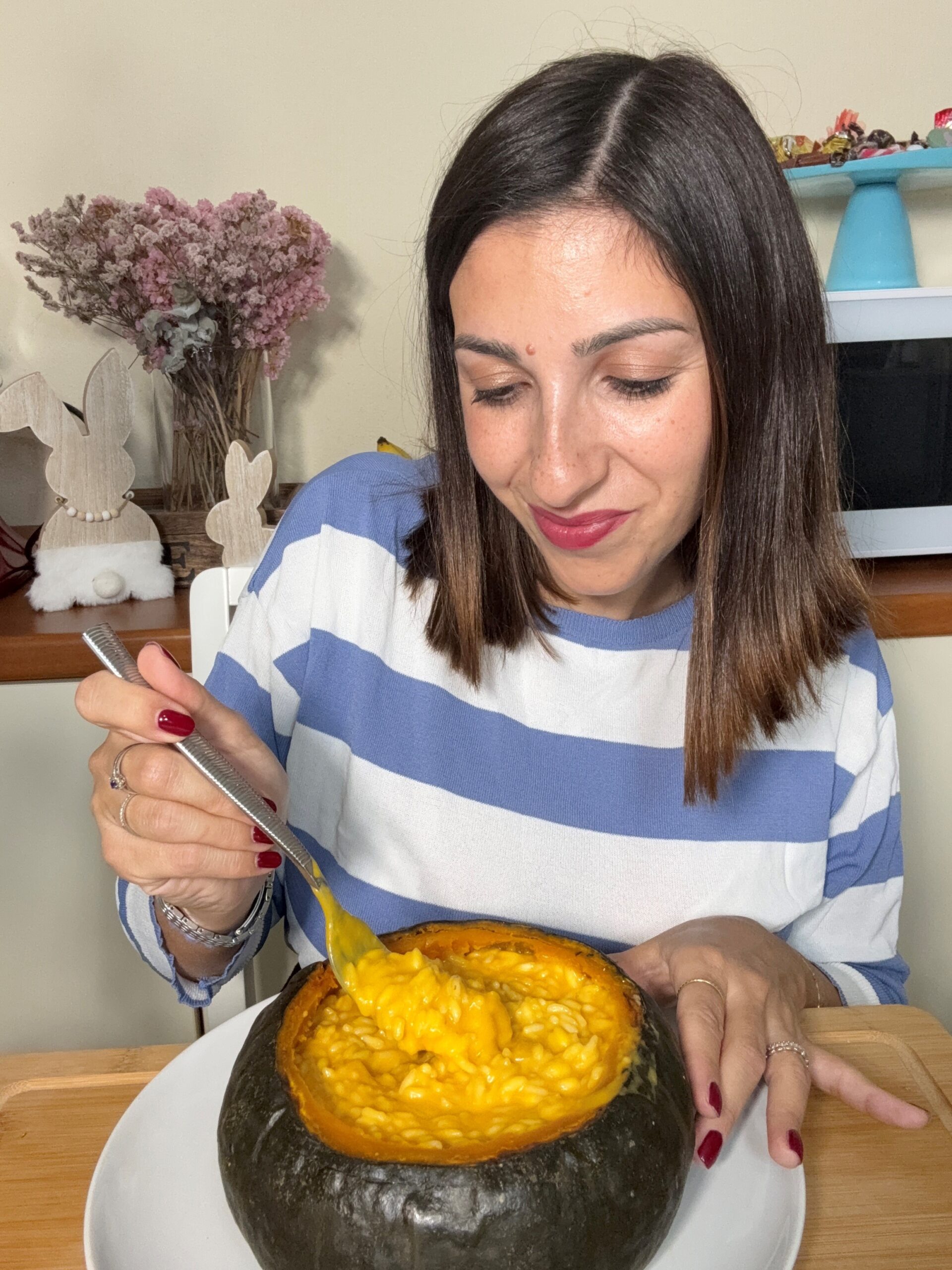 Ecco la ricetta di Alessandra Nioi del risotto alla zucca servito in una zucca delica! Ingredienti per 4 persone Procedimento Servizio Servi il risotto direttamente nella zucca, così da creare un piatto scenografico e gustoso. Buon appetito!